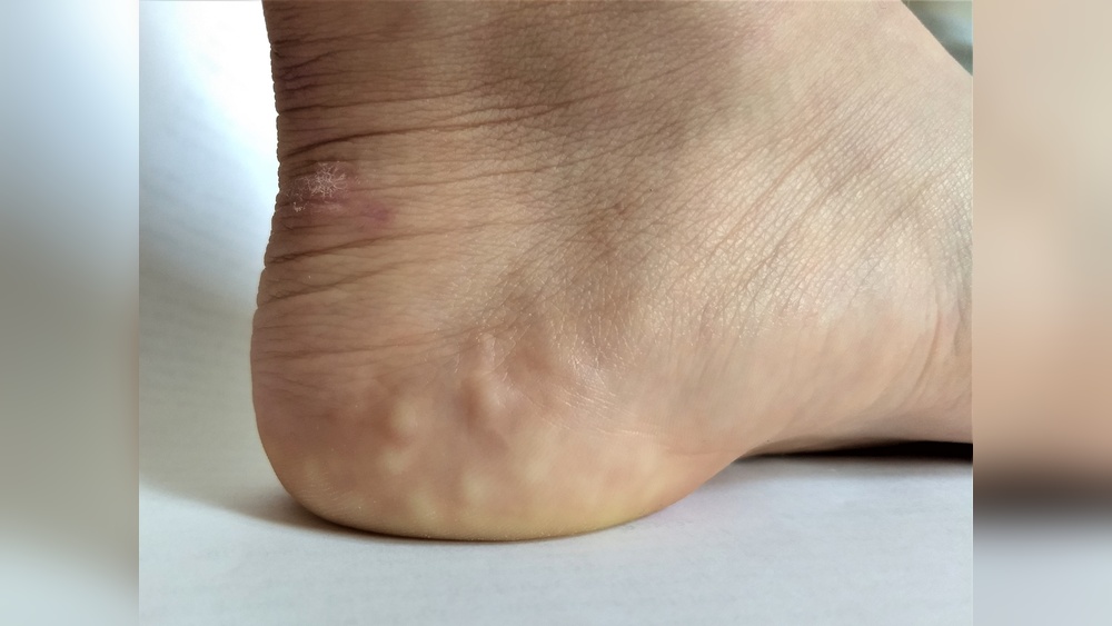 - Observation of soft, skin-colored bumps on the heel.